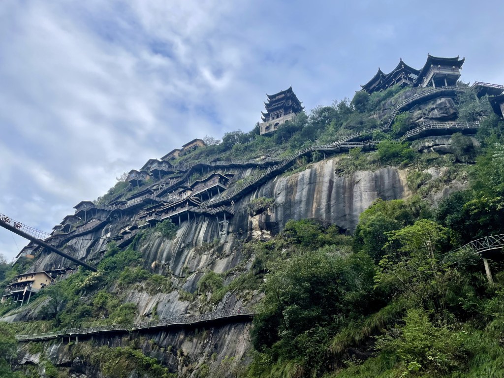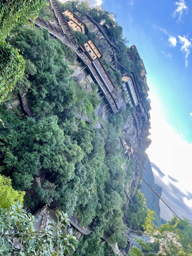 The valley is very different by day. It’s clear that it is a resort and recently built for tourism purposes, rather than the buildings having any long-standing history. An information board told us that the valley had been plagued by flooding – buildings were destroyed, roads washed away and a town and it’s people found themselves submerged in water. Hope was lost until a celestial boat appeared, floating through the floodwater to save them, while white cranes transformed into bridges to help them cross from side to side. A Taoist temple now sits above the valley, telling this tale and offering both a place of peaceful reflection and incredible views.