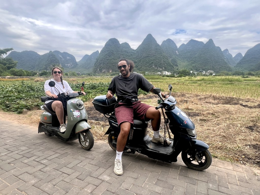 After dodging the people mountain, people sea of visitors in Yangshuo town, we next made for the countryside where we were to ride scooters around crop fields. Zach had never scootered before and I had been sans-scooter since my trip to Vietnam in 2019 where I was less than confident. The awkward idiots abroad risk factor was high on this one folks!