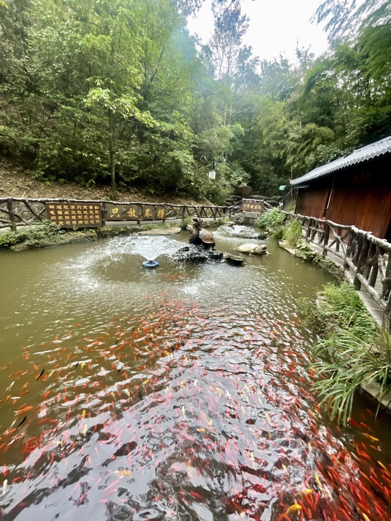We meandered around the pristine walkways, stopping to cross the red ribbon-laden ‘No.1 bridge in the world’ and a longevity pool where you can buy a goldfish and unceremoniously toss it from fish bowl to pond in a bid for immortality. At £1 a fish, we admired the business acumen of the shop owner and wondered if she spent her evenings scooping the fish back out the pond, ready for resale and re-release the following day…